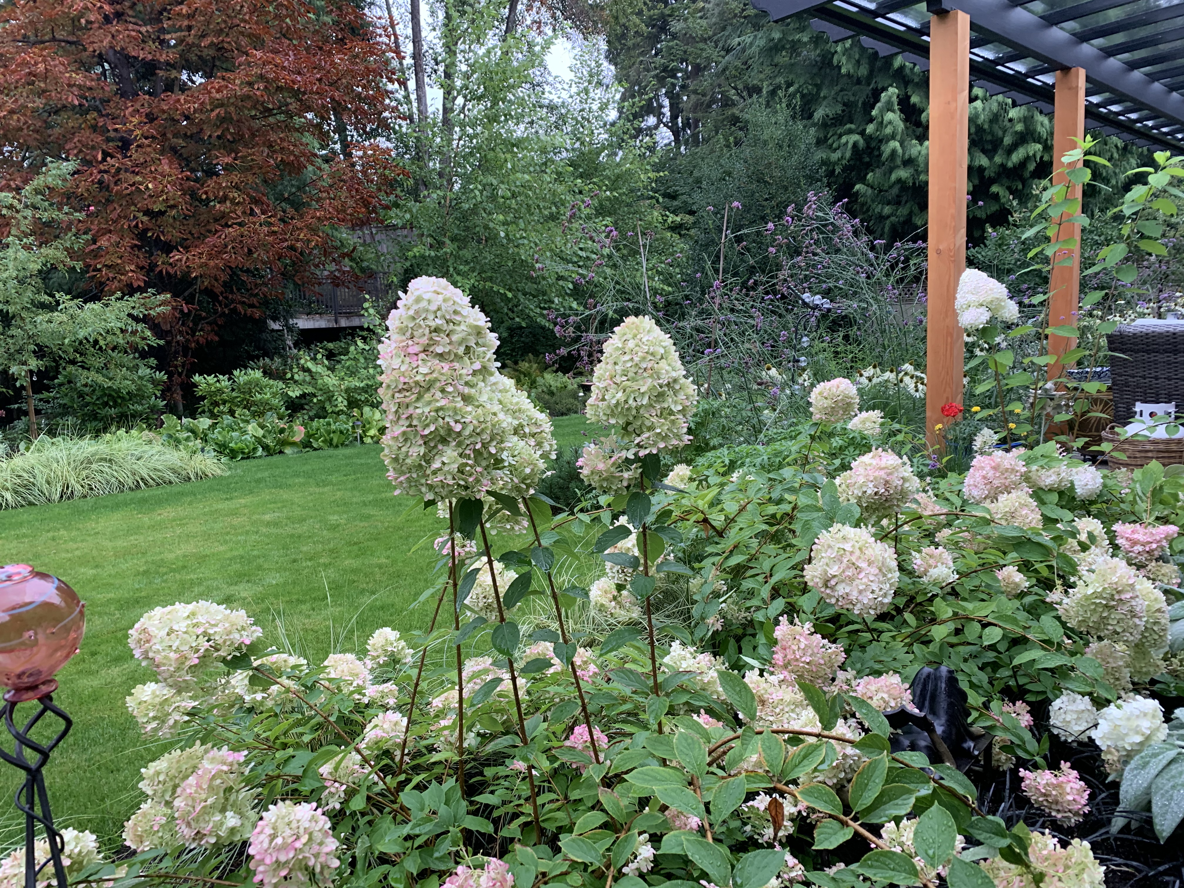 A Hollingsworth classic mid century style home near Edgemont village in North Vancouver. The back yard was a clean slate after large conifers were removed years prior. The goal of this garden was to add a lot of colour and multi season interest. Initially the yard was very exposed to the neighbours, to blur this boundary a natural looking barrier was implemented with the use of mixed shrubs and trees. The gardens towards the back of the property were planted with winter interest in mind using a great deal of native plants that would tie in well with the small stream that runs along the back. The views from inside the home are beautiful during the winter months now with colourful stems, winter flowering heaths and the exfoliating bark from the birch trees. The gardens closer to the house surrounding the patios are filled with summer perennials attracting pollinators and adding texture , movement, and feeling. Since the glass awning was installed the clients are able to enjoy almost every month of the year in their garden, with many birds and pollinators visiting regularly.